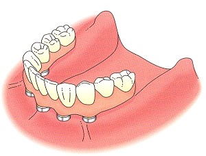 To solve this problem, we sometimes make a denture that is retained by implants submerged in the bone.